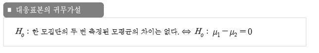 대응표본 : 한 모집단으로부터 얻어진 대상에 대하여 두 번 반복 측정하여 얻어짐