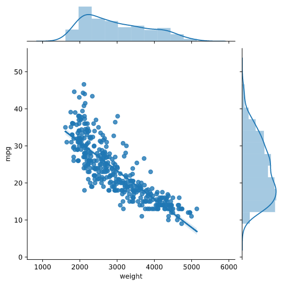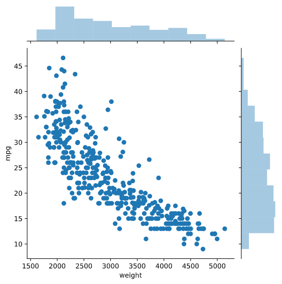- Seabon, sns.joinplot : 두 변수의 히스토그램이 x,y축에 별도로 표시되는 특징이 있음