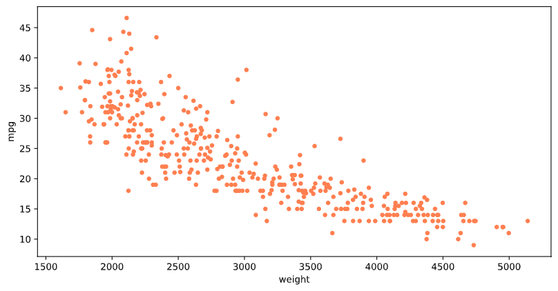ndf.plot(kind='scatter', x='weight', y='mpg', c='coral', s=15, figsize=(10,5))