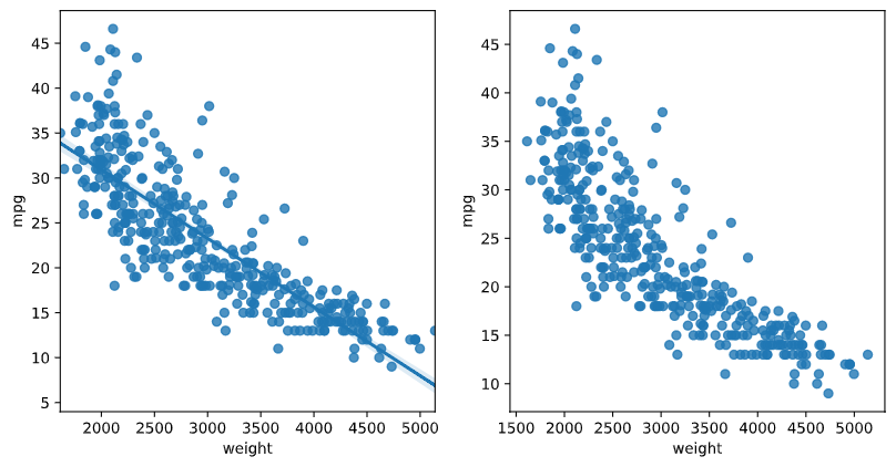 sns.regplot(x='weight', y='mpg', data=ndf, ax=ax2, fit_reg=False) # 회귀선 미표시