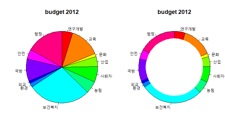 pie(budget2012$budget, radius=0.8, col="white", labels=NA, border=NA) # 도넛 차트 만들기