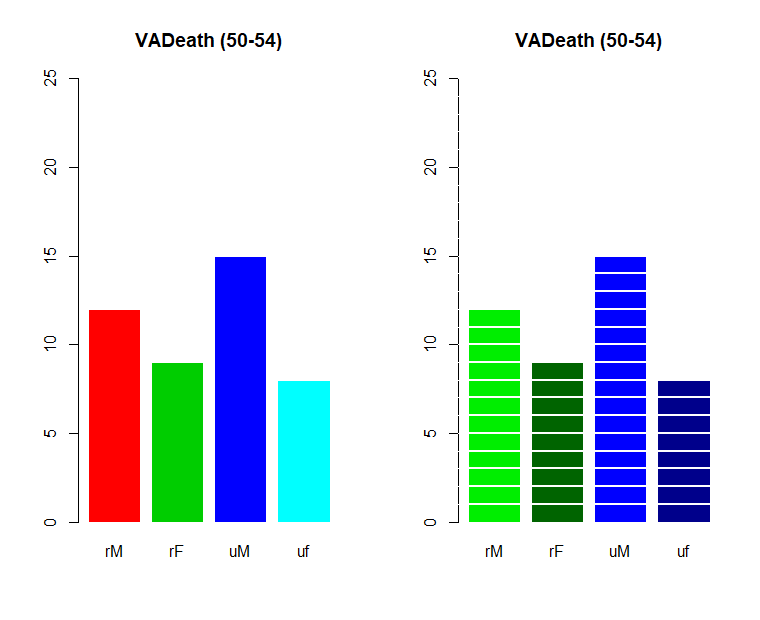 barplot(round(VADeaths[1,]), col=2:5, border="white", ylim=c(0,25), main="VADeath (50-54)")