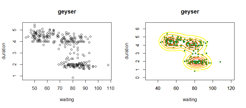 data(geyser) # 온천데이터 - 변수 waiting, duration