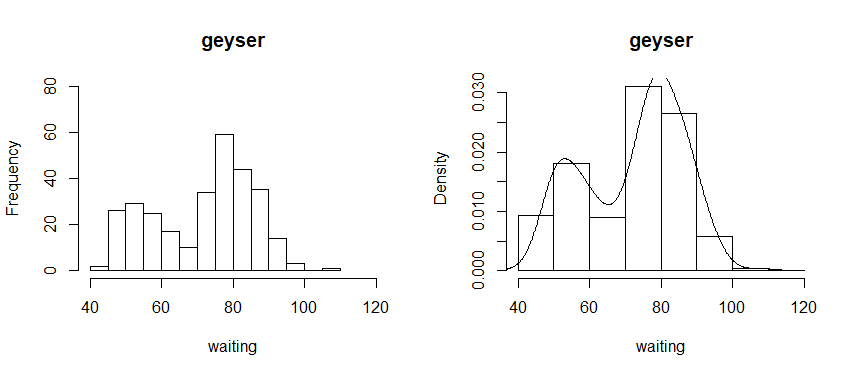 hist(geyser$waiting, breaks=seq(40,120,by=10), main="geyser", xlab="waiting", probability = T) # y축이 density로, 밀도 조절