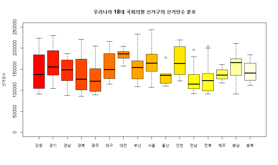 boxplot(선거인.수~시도, col=heat.colors(16), ylim=c(0,250000), ylab="선거인수", main="우리나라 18대 국회의원 선거구의 선거인수 분포")
